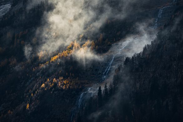 Sous des influences picturales et cinématographiques, la série cherche à retranscrire des atmosphères, à insuffler dans chaque image une histoire et une expérience. En cela, les éléments climatiques les plus tourmentés agissent comme un révélateur, ouvrant des fenêtres éphémères sur un monde insoupçonné et exacerbant le « sauvage » qui règne dans cet univers vertical. Dans la prolongation de cette démarche, le parti pris s’est imposé naturellement de fuir toute trace humaine pour évoquer une époque antérieure à l’anthropocène, un ailleurs primitif et intact.